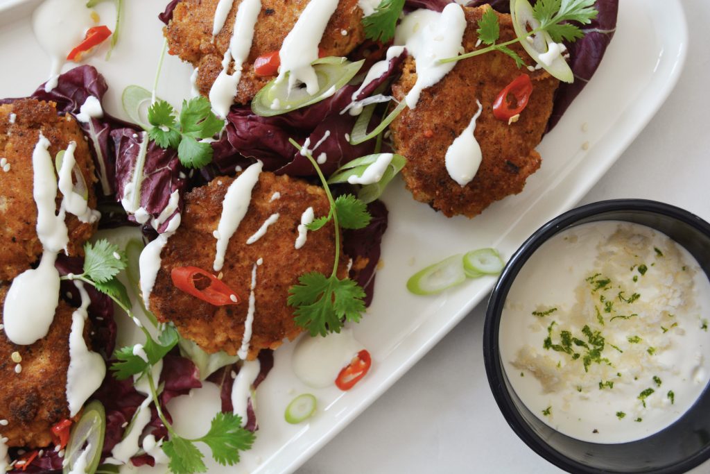 Asiatiske krabbekaker med rømmedressing