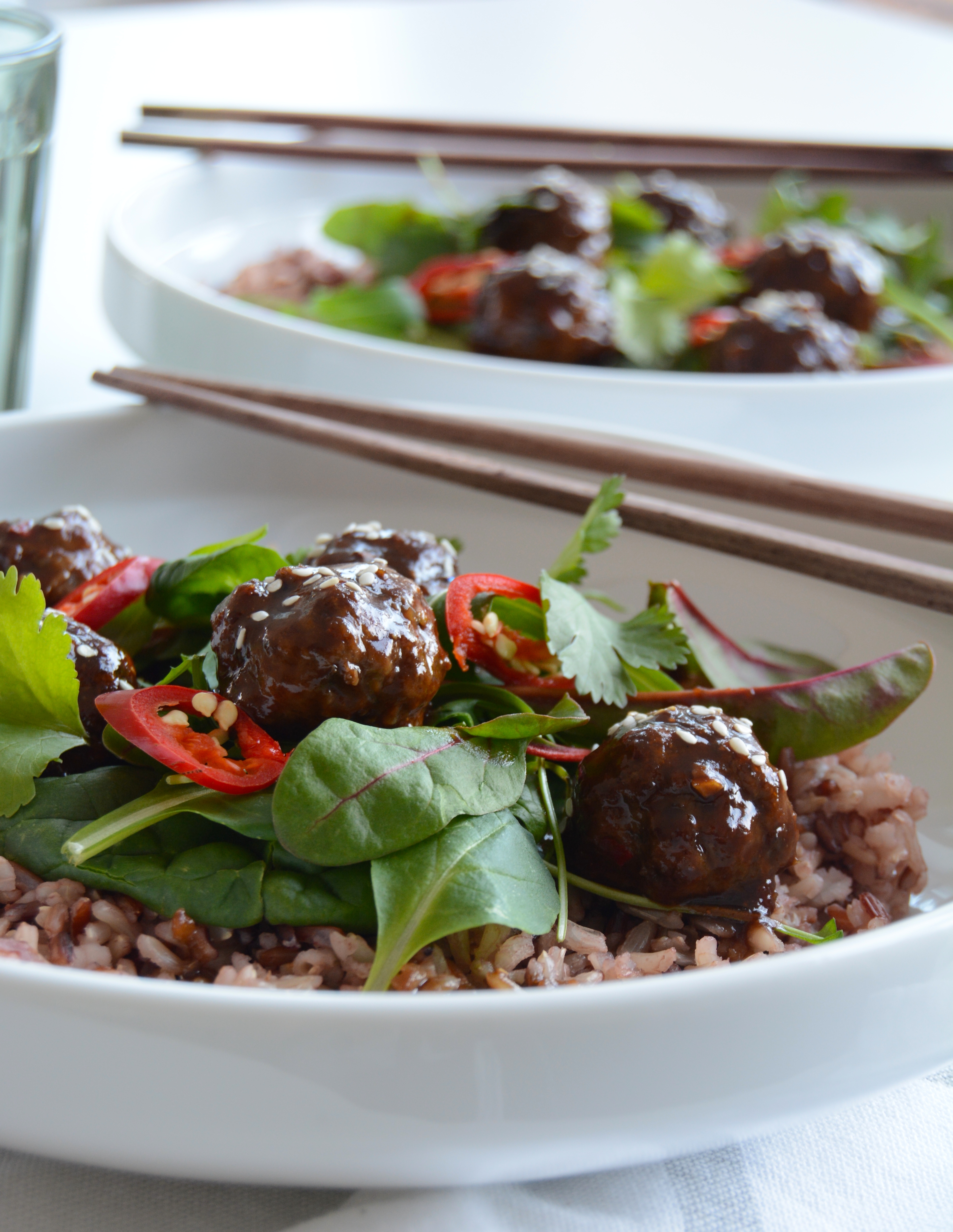 Dipp asiatiske kjøttboller i spicy hoisinsaus, dryss sesamfrø over og server som den er på en seng av mix salat med frisk koriander til fingermat eller med ris til middag!