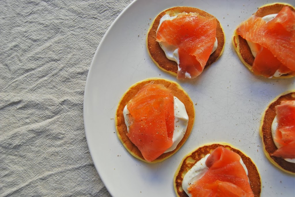 Blinis pannekaker med creme frâiche og røkelaks