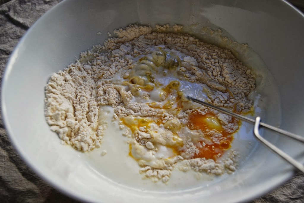 Bland alt det tørre og visp egg og kefir til en jevn og klumfri blanding. La røren svelle i ca. 30 min.