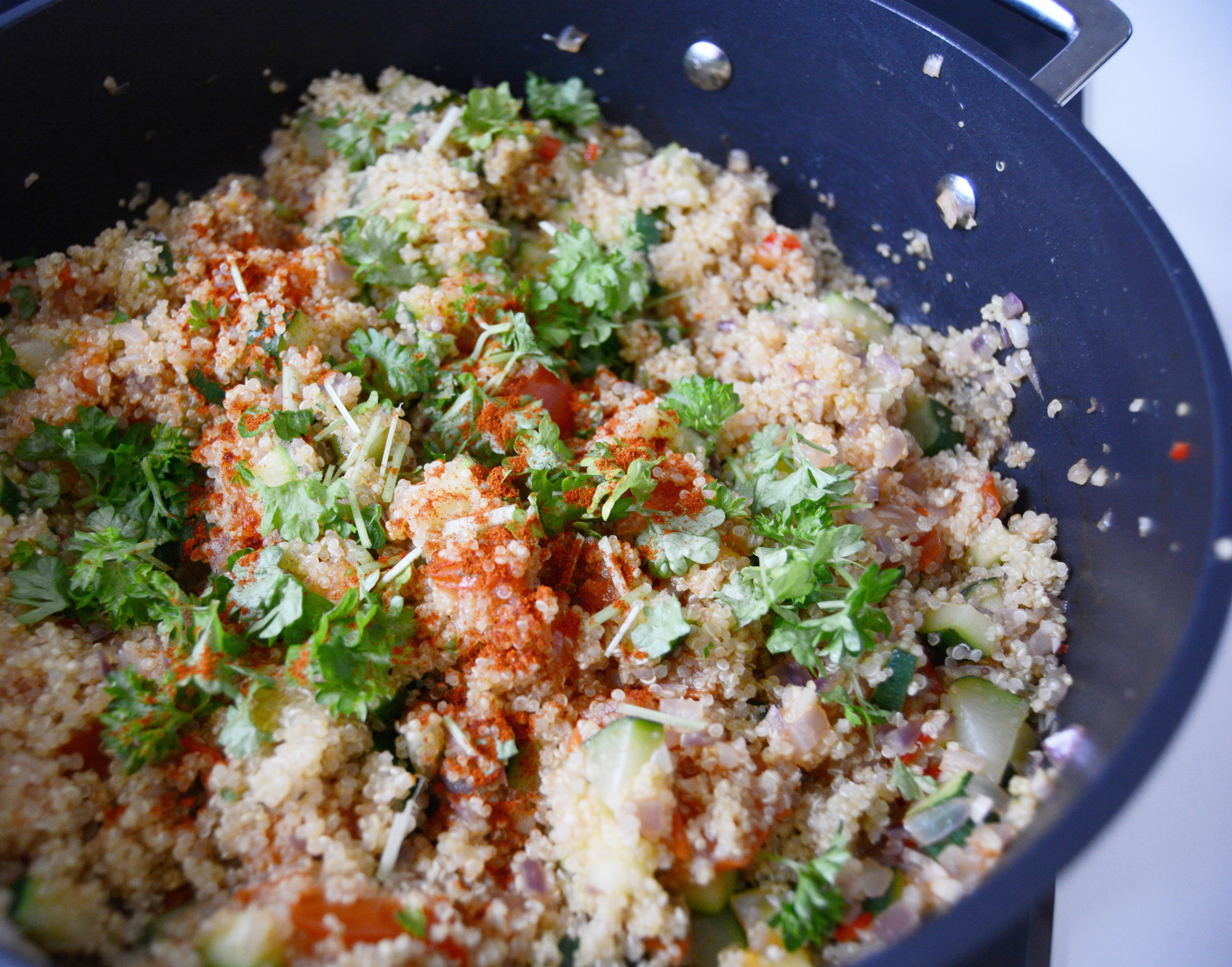 Ha hakkede hvitløk med 2 ss olivenolje i en panne på middels høy varme. Tilsett squash, løk og chili og la det stek i ca. 5 minutter eller til squashbitene begynner å bli møre. Tilsett persille, tomater, kokt quinoa og paprikapulver. Bland godt sammen og la det steke til i ca. 5-10 minutter. Tilsett til slutt salt og pepper.