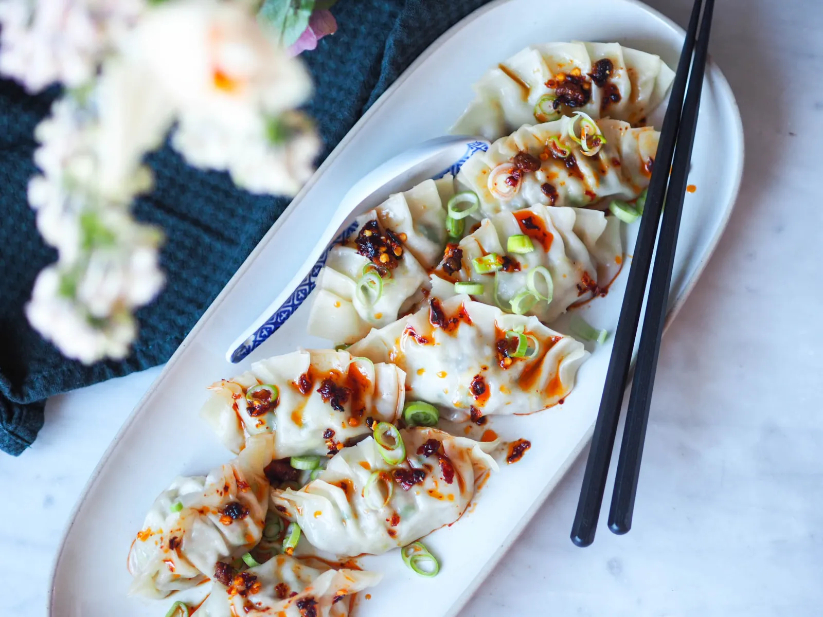 Tiden flyr helt klart. Vi hadde vår første barnefrikveld sammen på nesten et år like før påsken(!). Med muligheten til å slappe av og nyte middagen sammen og se en skrekkfilm med full volum på, er små gleder som vi setter så stor pris på om dagen! Til fredagsmiddagen lagde jeg japanske dumplings (gyoza), som en av våres favorittdumplings. Det kan se ut som at det er vanskelig og mye jobb med å lage gyoza, men selve metoden er kjempe enkel og er du rask til å kutte grønnsaker, tar maks en time å lage til sammen. Det som skiller gyoza med andre dumplings er spesielt hvordan de er tilberedt på. De fleste dumplings og dimsum blir kun dampet i en bambuskurv med lokk, stekes gyoza først i olje i en panne til de er gyldne og sprøe i bunnen og deretter dampes. På denne måten får også gyoza ulike teksturer med en sprø bunn, myk form og en saftig fyll. Selve fyllet kan du variere selv med andre grønnsaker eller kjøtt, evt. uten kjøtt. I dag har jeg valgt å vise en litt mer av en klassisk gyoza oppskrift med en spicy dumplings dipp til, og disse er noe av de beste dumplingsene jeg har laget!