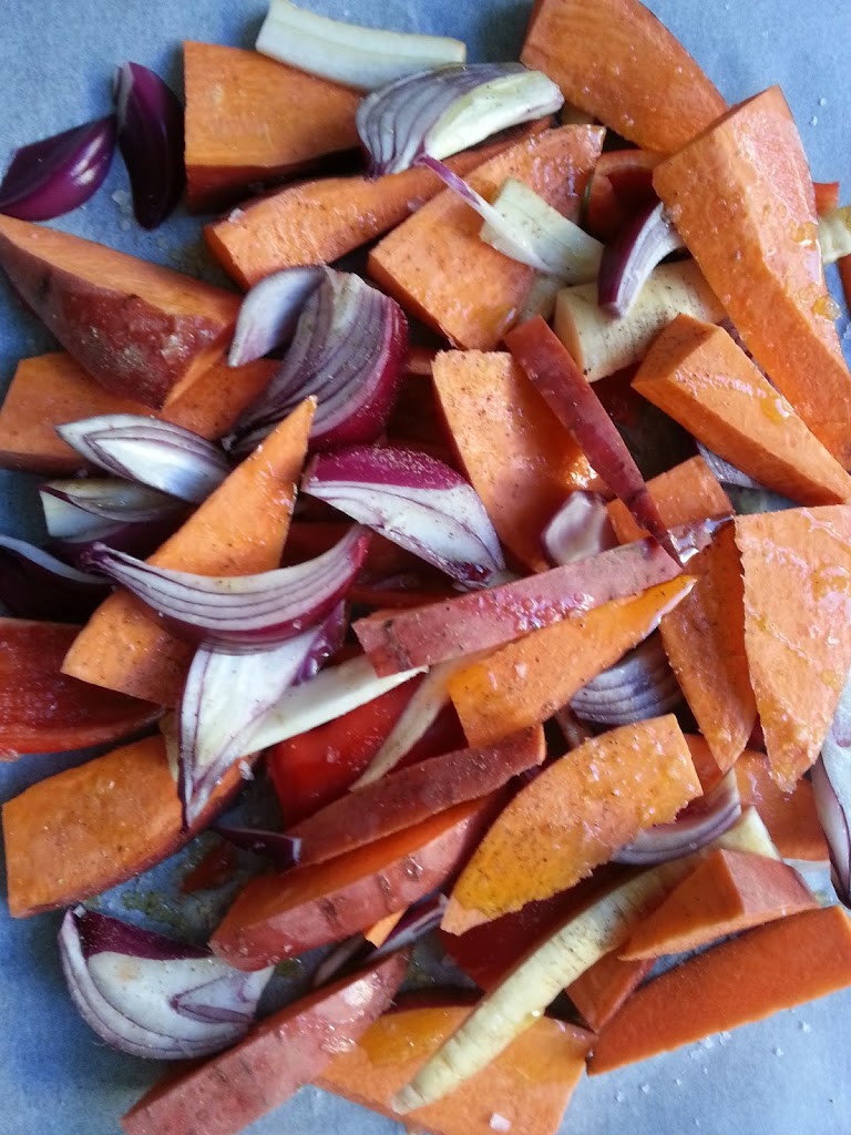 Kutt opp grønnsaker i store biter. Dryss over med olivenolje, salt og pepper. Stek grønnsaker på miderste rille i ca. 15-20 min, eller til grønnsakene er møre og gylde.