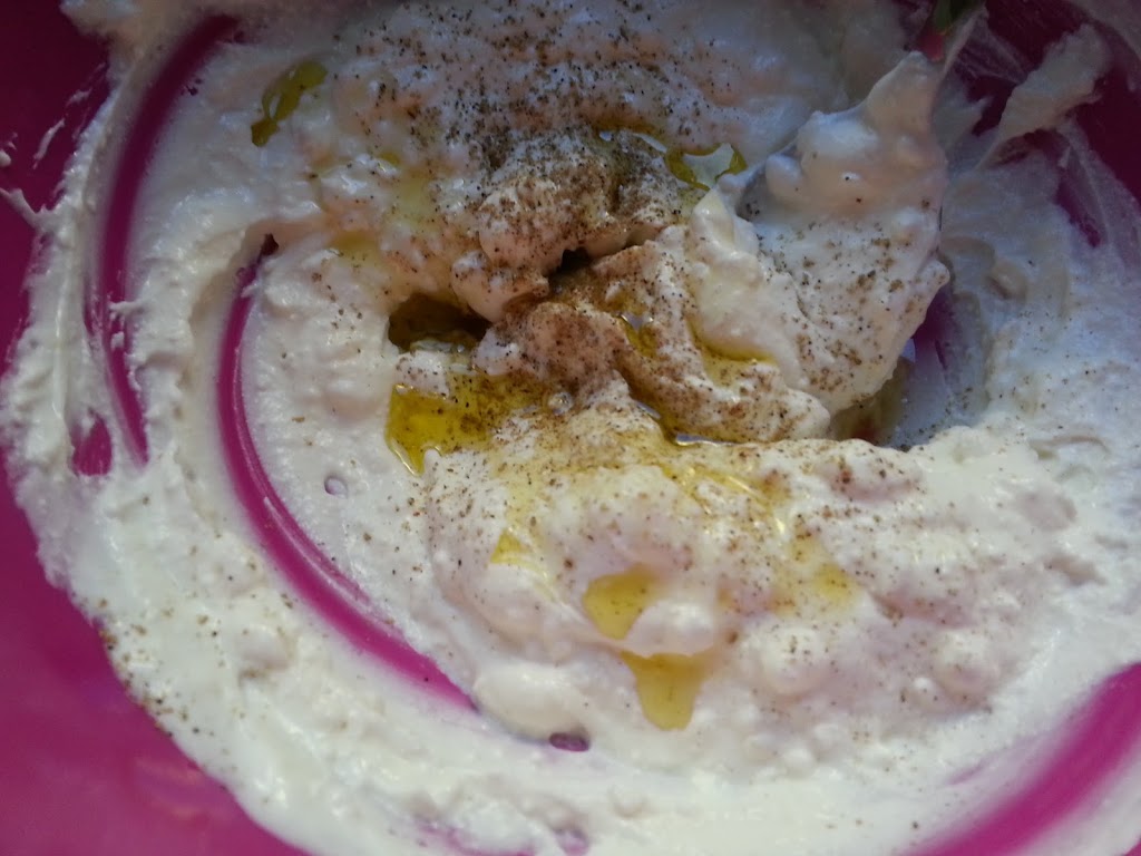 Rør inn kremet fetaost sammen med kesam og bland inn olje og krydder (paprikapulver, salt og pepper).