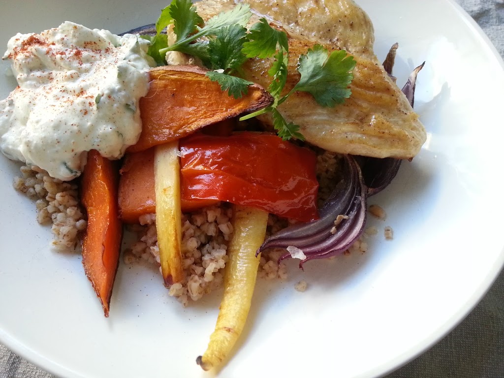 Denne retten er inspirert av middelhavet og er noe av det sunneste middagsalternativ for hverdager og fest. Man kan variere med grønnsaker og kjøtt, f.eks. lam eller biff for festmiddag? Av grove grønnsaker har jeg valgt min yndlings kombinasjon av ovnsbakte grønnsaker; søtpoteter, rødløk, søt paprika og pastinakk. Her kan du variere med gulerøtter, brokkoli eller kålrot. Prikken over i’en er dressingen. En rik og fyldig dressing, hvor kombinasjonen består av kremet fetaost og kesam.