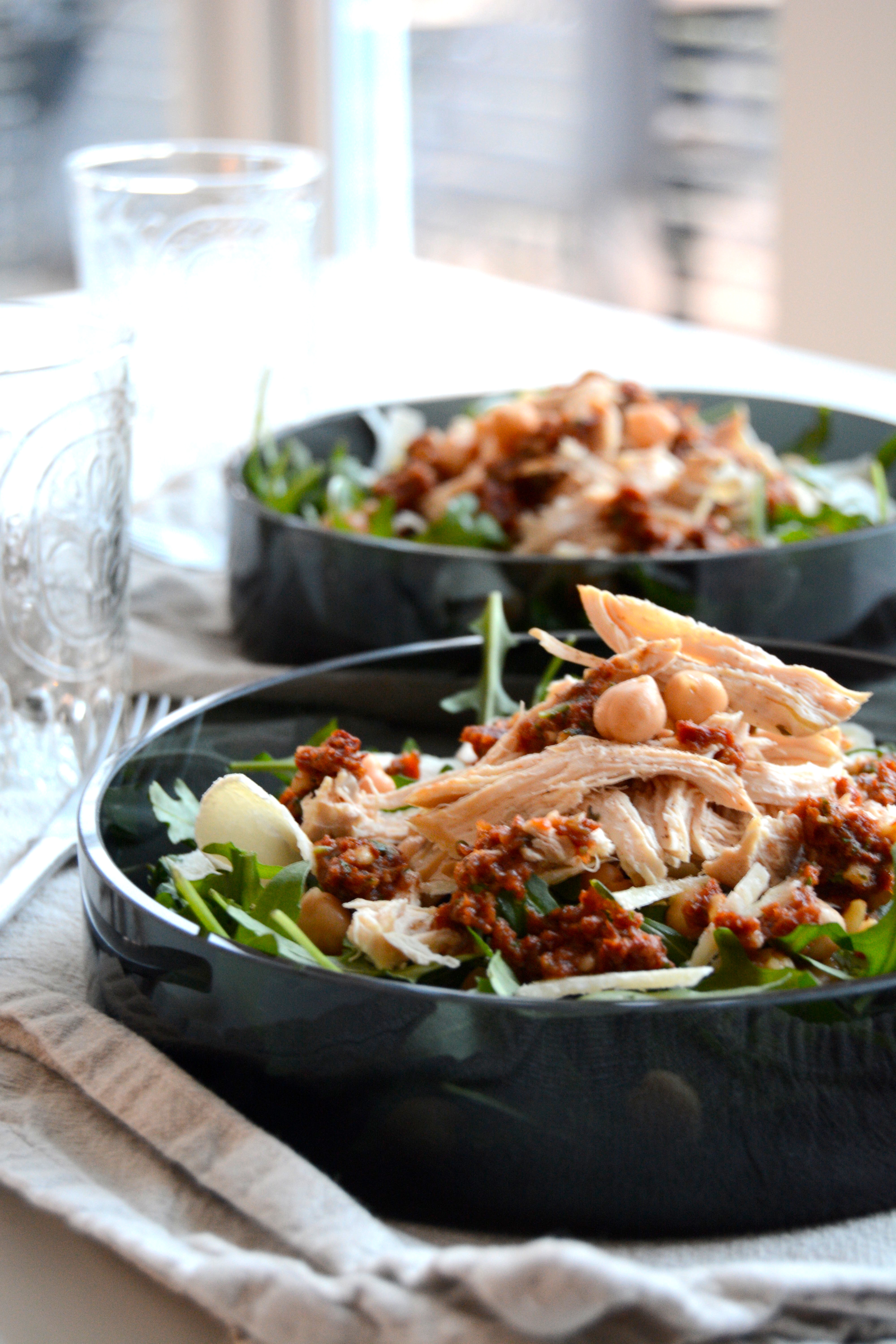 Når kyllingfiletene er ferdige, kan du rive de med to gafler. Legg til slutt opp salatene, sammen med kikerter, revet kylling, grov rød pesto og til slutt revet parmesan.