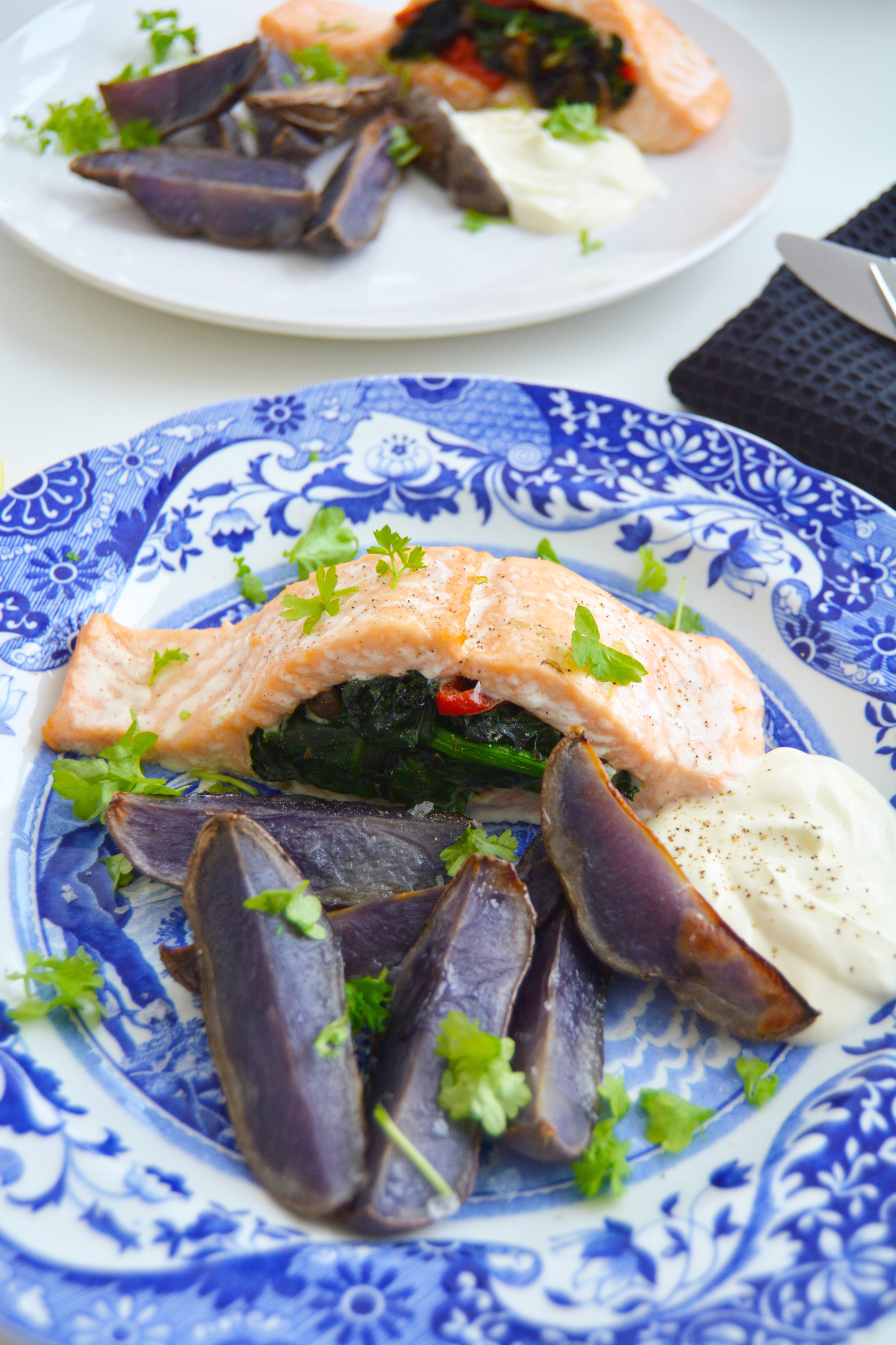 Bruk gjerne spinatfyllet til ørret- eller torskefileter! Server sammen med ovnstekte båtpoteter eller andre rotgrønnsaker, og med en frisk rømmekladd ved siden av.