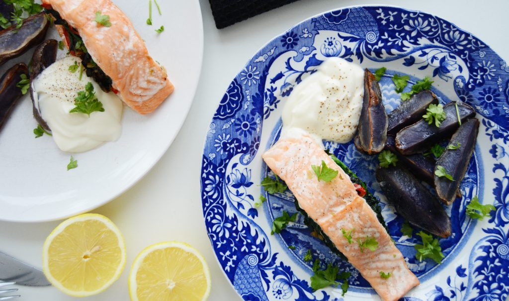 Laks fylt med spinat, sopp og søt paprika