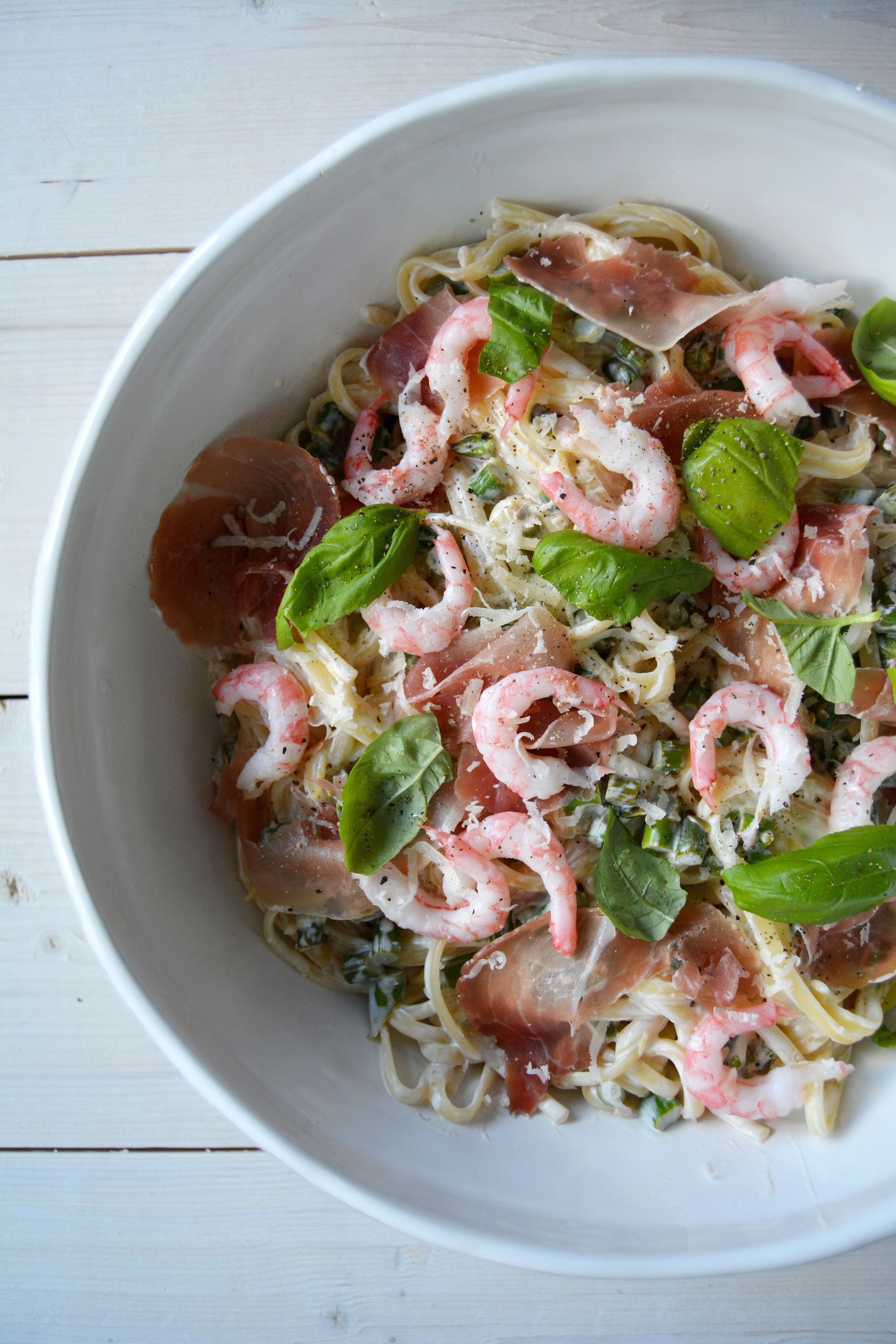En enkel sommerlig og kremet pastarett som passer både som helge- og hverdagmat med en liten variasjon på 45 minutter. Her har jeg brukt linguine som er en båndpasta som ligner på spaghetti og er like flat som tagliatelle, men mye smalere. Jeg har også laget en kremet saus, sitronskall og saft som gir enda friskere og lett smak til retten. Inspirert av norsk sommer har jeg brukt asparges, spekeskinke og ferske reker til retten, men oppskriften passer også veldig godt med varmrøkt laks eller kylling! 🙂