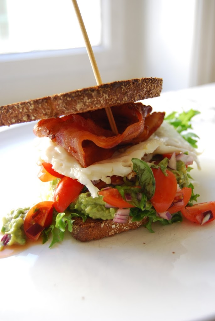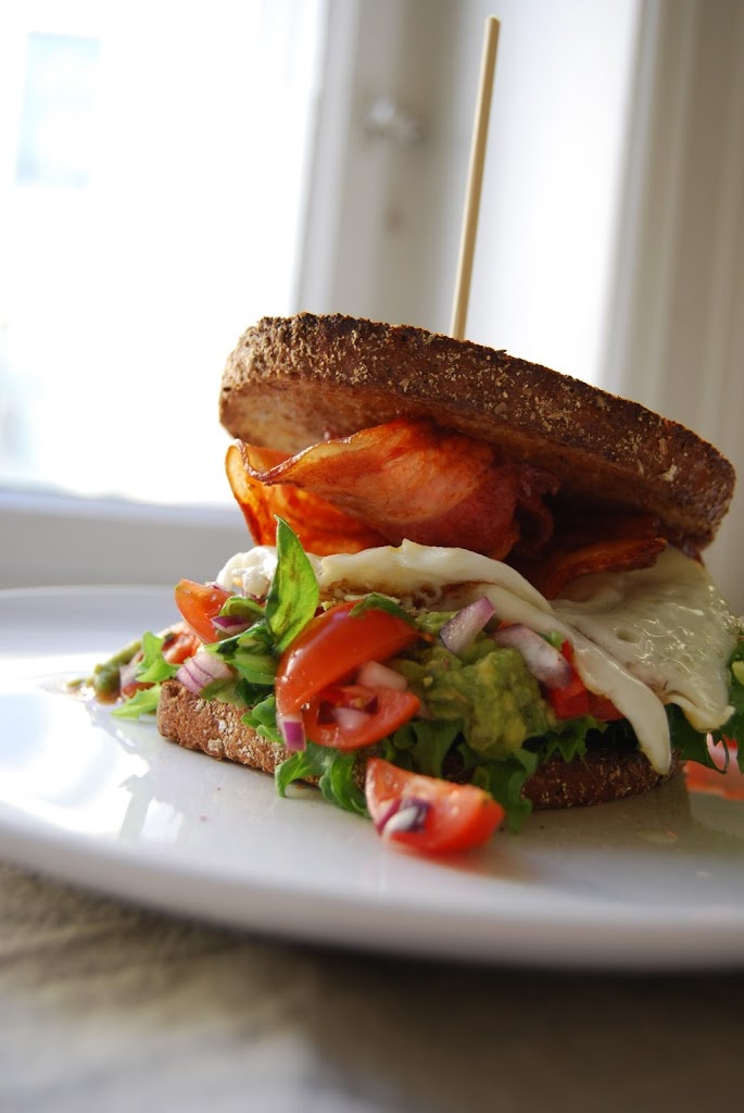 Smør guacamole på toasted brødskive, legg på pica de gallo, egg, bacon og toasted brødskive. Hold Club Sandwich sammen med et grillspydd.