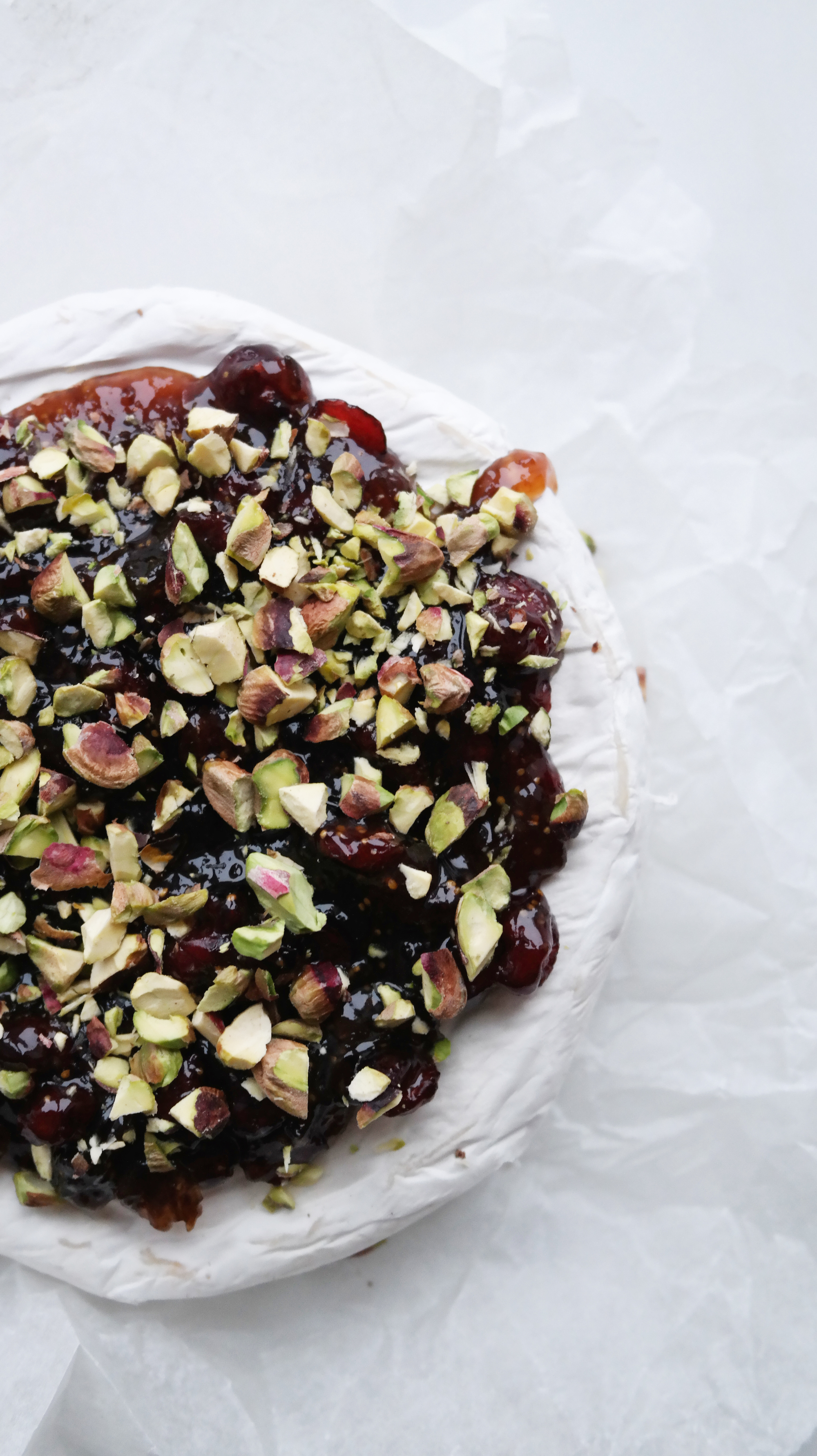Ovnsbakt brie med fikenmarmelade, tranebær og pistasjnøtter: