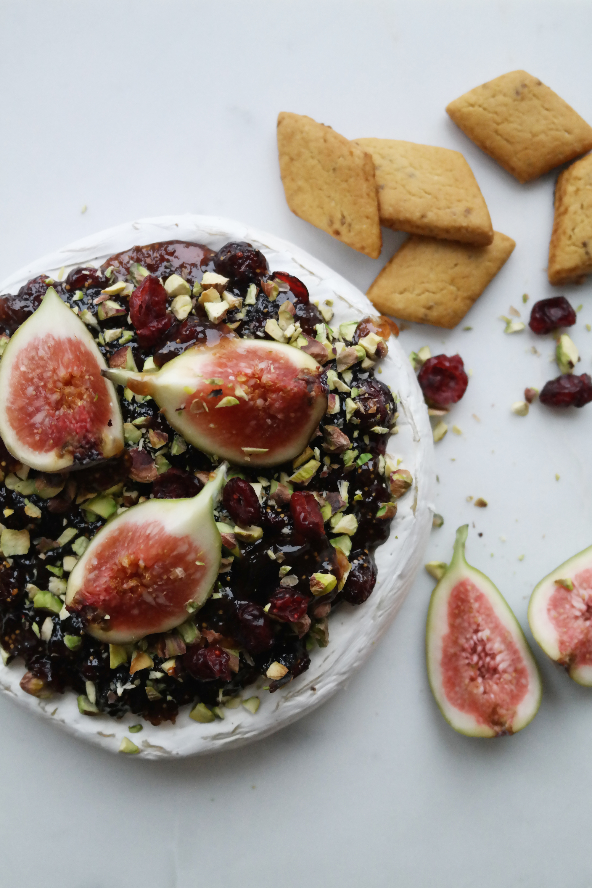 Ovnsbakt brie med fikenmarmelade, tranebær og pistasjnøtter