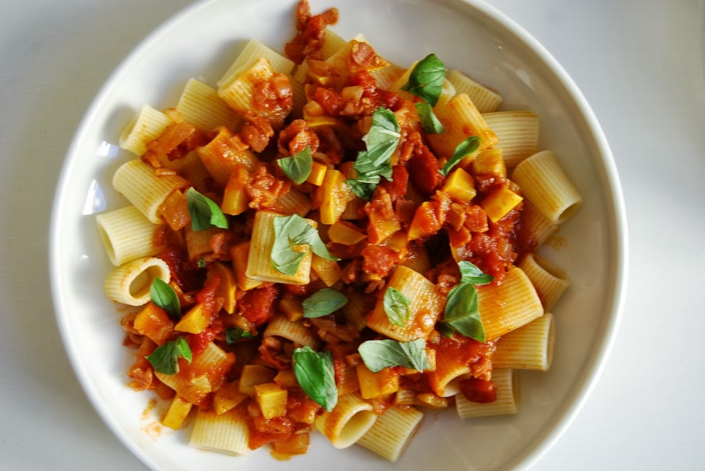 Pasta med tomatsaus og gul squash