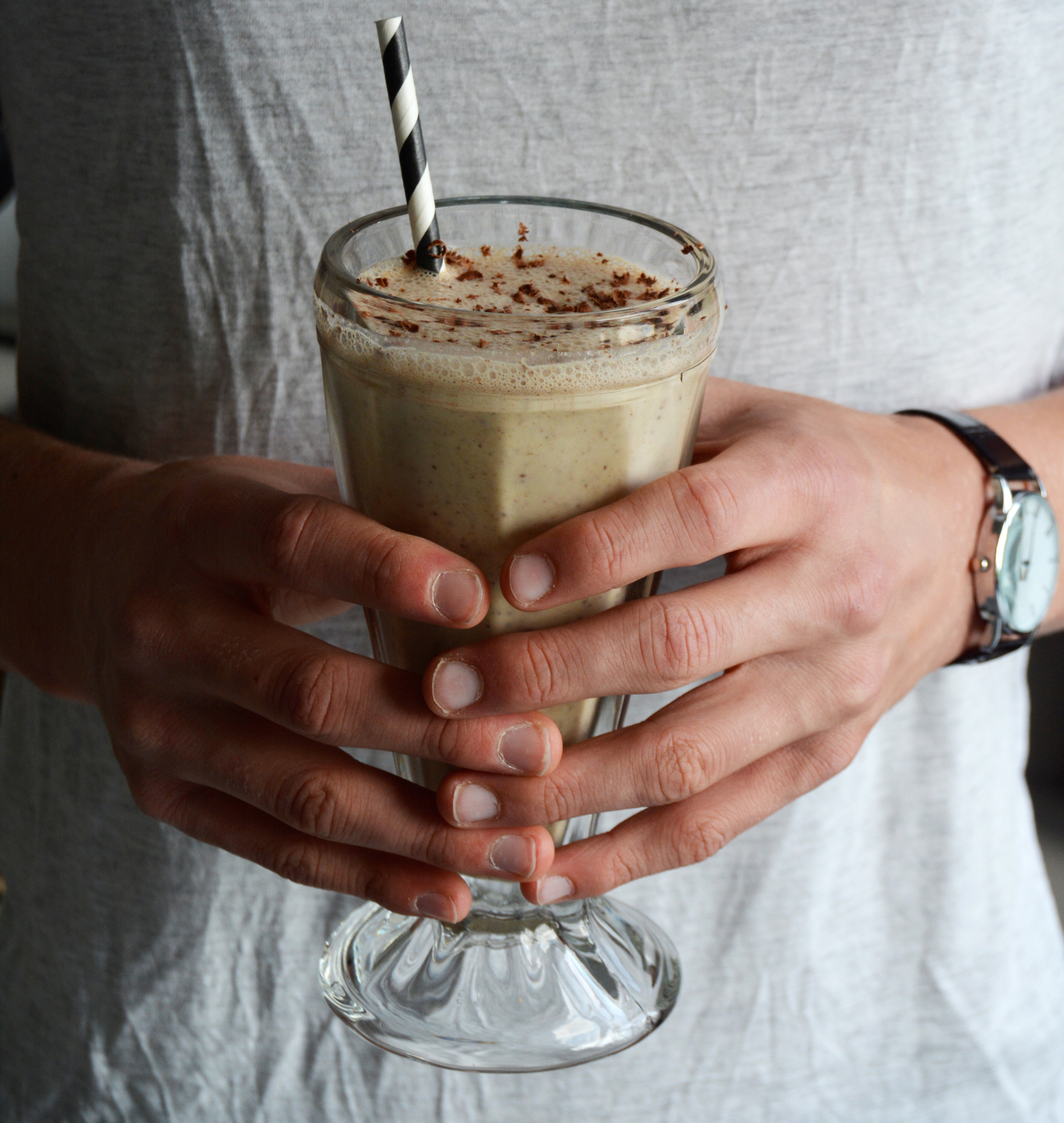 Peanøtt-sjoko-smoothien består av peanøttsmør, frosne bananskiver, sjokoladebiter, kanel og Alpro Mandeldrikk usøtet og smaker nesten som en milkshake, men er mye sunnere og mer næringsrik. Smoothien er proppfulle av sunne fettsyrer og proteiner fra peanøttsmør og Alpro Mandeldrikk usøtet, og gir meg et sunt alternativ til en rask energipåfyll etter harde treningsøkter eller når jeg får lyst på noe søtt med sjokoladesmak etter en lett middag. Den er fyldig og rik på smak, og nokså mettede. Det går helt fint å tilsette 10-12 isbiter i tillegg, dersom man ikke har frosne bananskiver i fryseren og tilsett gjerne mørk sjokoladepulver med et høyt kakaoinnhold. Smoothien smaker aller best kald!