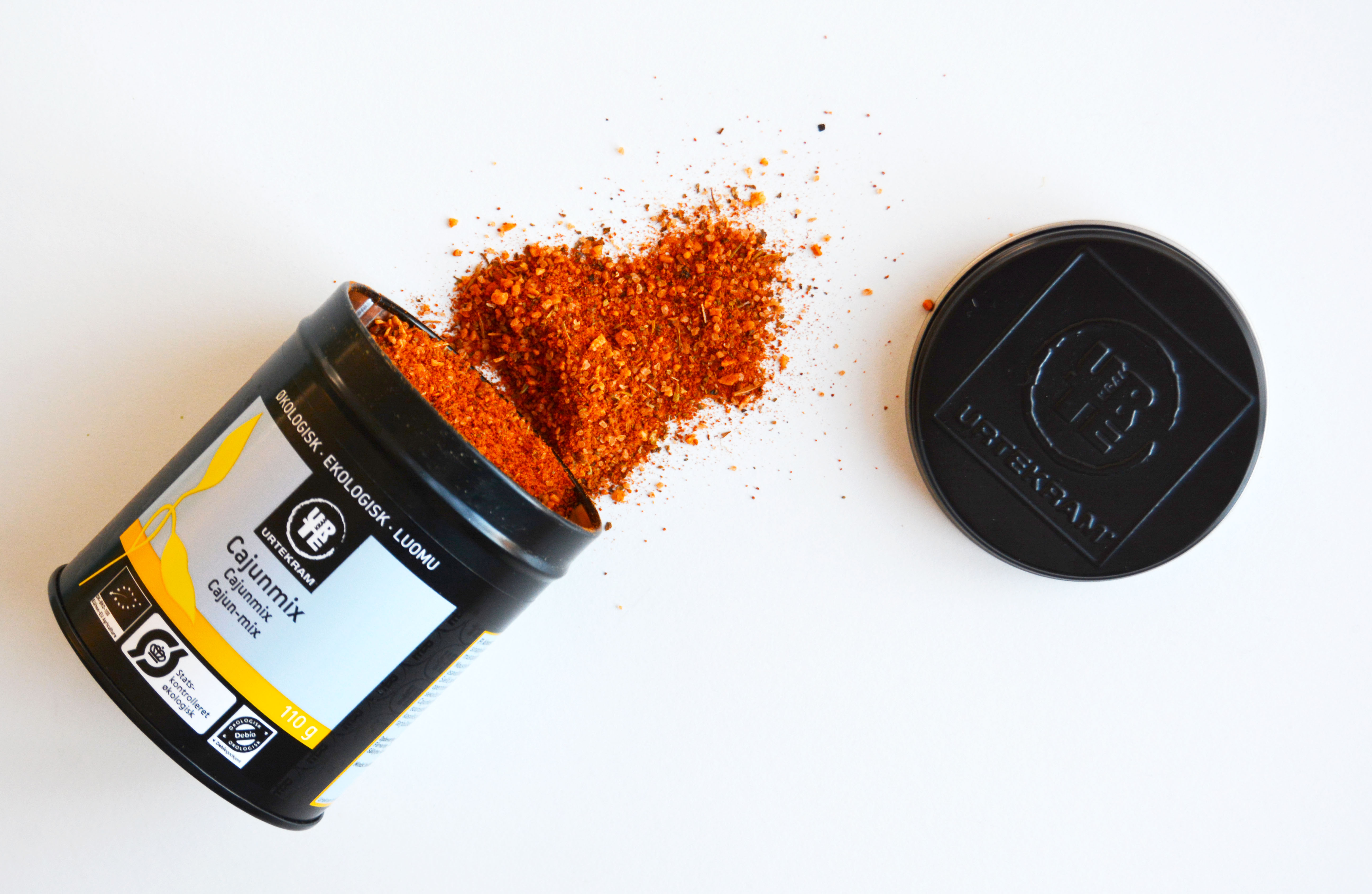 Inspirasjon til denne cajun scampi med sprø salat og frisk koriander er hentet fra sørstaten Louisiana i USA, hvor det cajunkjøkkenet stammer fra. Denne sorte lekre boksen inneholder økologiske cajunkrydder med intense elementer som får maten til å dufte og smake eksotisk! Med denne kryddermiksen trenger du ikke å tilsette salt i retten, i tillegg til ulike cajunkrydder inneholder miksen også Himalayasalt!