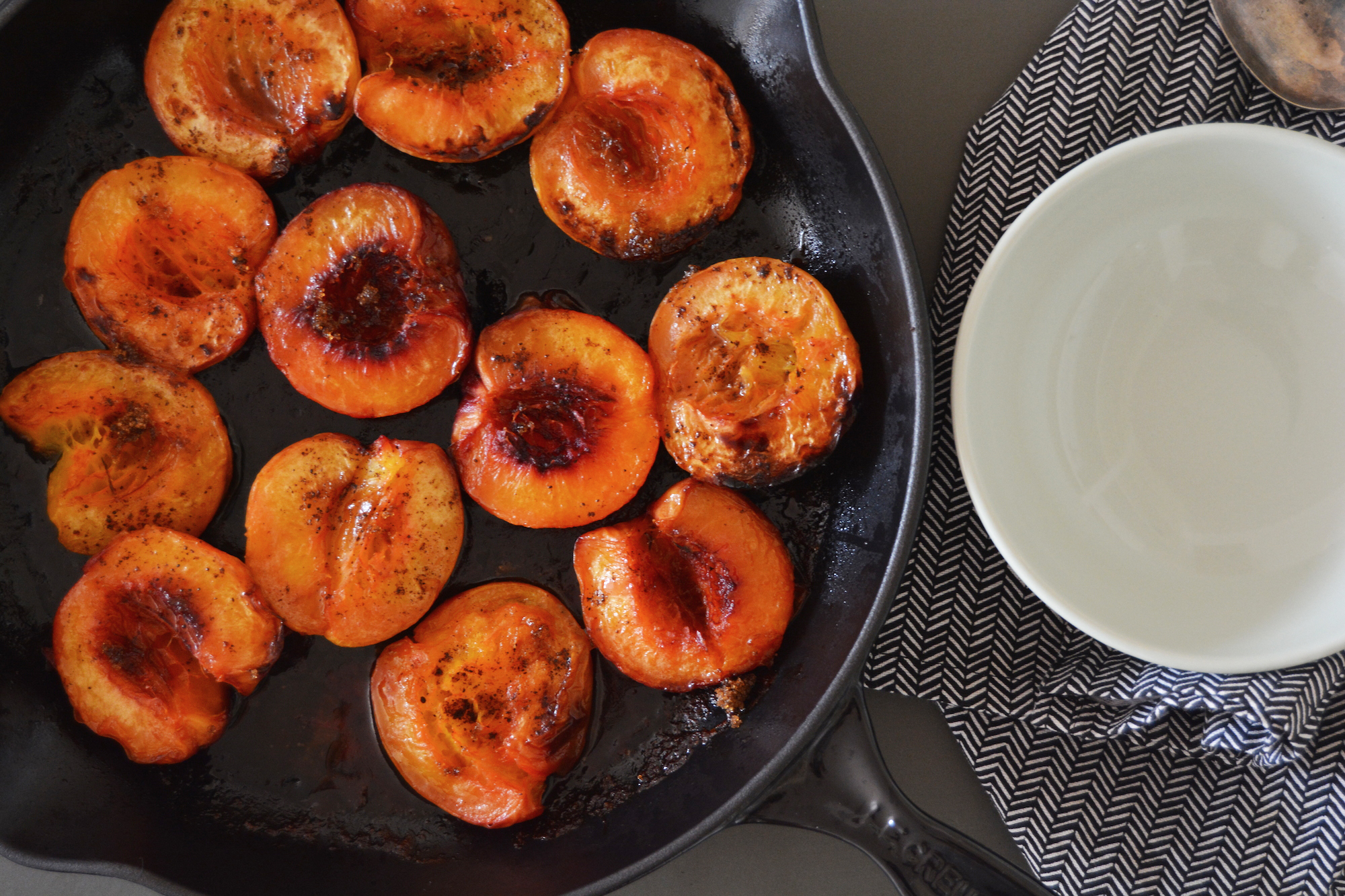 Del fersken i to og fjern stenene. Legg de i en ildfastform sammen med smør og strø brunt sukker og kanel over. Stekes på midterste rad i ca. 10 minutter til de er noe møre og er gyldne. Skrap ut vaniljefrø og bland sammen med honning eller lønnesirup, og dryss over fersken rett etter at de er tatt ut fra ovnen.