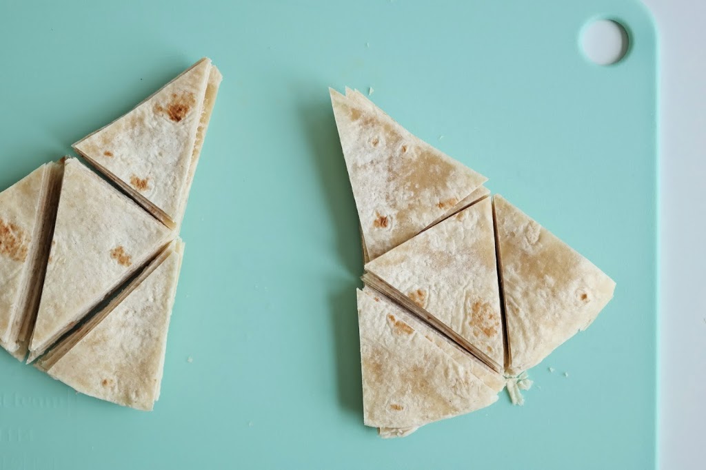 Sett ovnen på 200 grader. Del opp tortillalefser i trekanter eller i snipper med skarp kniv eller pizzahjul. Bland paprika- og chilipulver sammen.