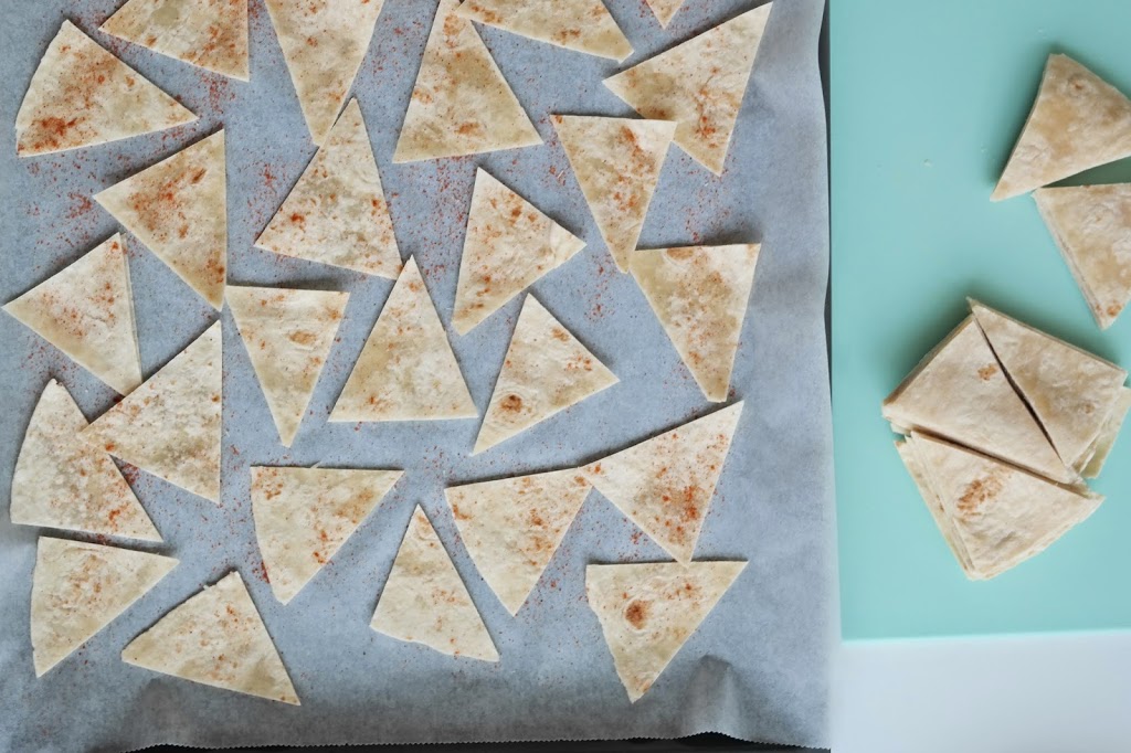 Legg tortillatrekantene på en stekebrett med bakepapir og dryss over paprika- og chilipulver.