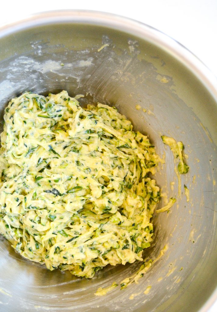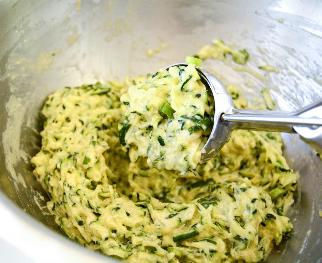 Strø salt over revet squash, bland godt og la det stå i 15 min. Klem deretter ut all veske og legg revet squash i en stor bakebolle. Tilsett vårløk, bakepulver, og pepper, og bland godt inn pisket egg før mel tilsettes. Rør godt til en tykk røre.