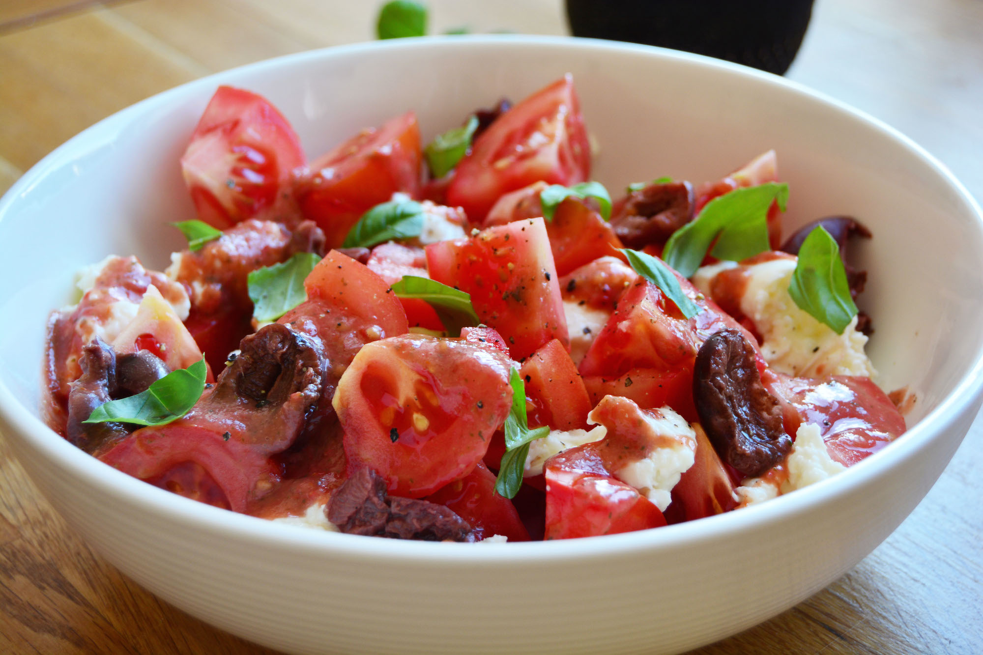 Lag salaten ved å kutte tomater i store kuber og legg de på en stor salatbolle sammen med katamala olivener. Riv mozzarella og basilikumblader over tomatene. Dryss tilslutt tomatvinaigrette over salaten!